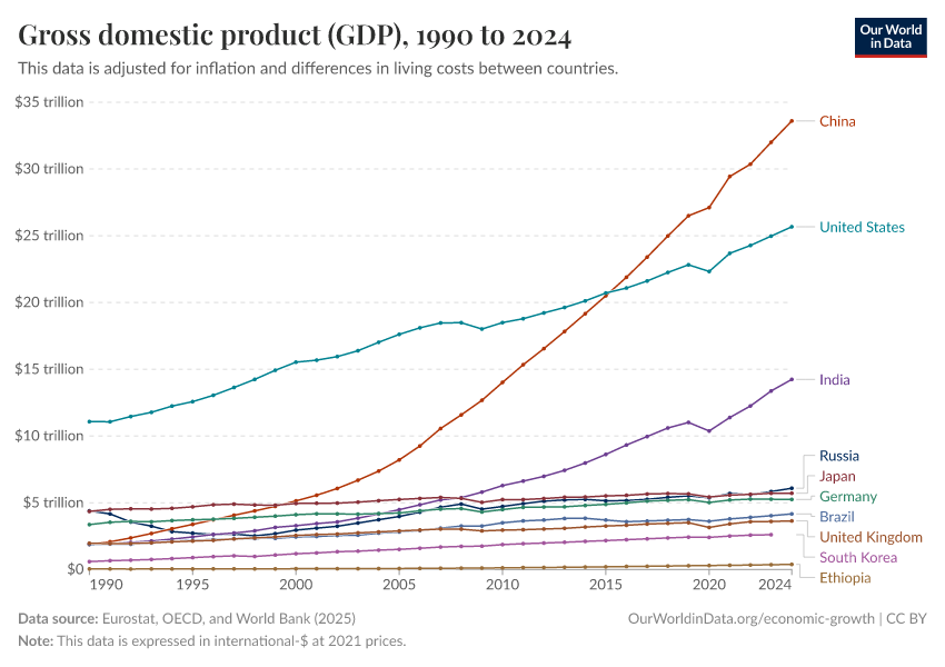 “Data Page: Gross domestic product (GDP)”, part of the following publication: Max Roser, Bertha Rohenkohl, Pablo Arriagada, Joe Hasell, Hannah Ritchie, and Esteban Ortiz-Ospina (2023) - “Economic Growth”. Data adapted from Eurostat, OECD, and World Bank. Retrieved from https://archive.ourworldindata.org/20250916-103535/grapher/gdp-worldbank.html [online resource] (archived on September 16, 2025).How to cite this data