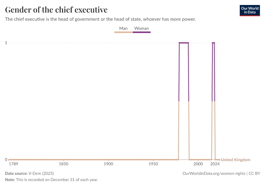 “Data Page: Gender of the chief executive”, part of the following publication: Bastian Herre, Lucas Rodés-Guirao, and Esteban Ortiz-Ospina (2013) - “Democracy”. Data adapted from V-Dem. Retrieved from https://archive.ourworldindata.org/20250909-093708/grapher/gender-of-chief-executive.html [online resource] (archived on September 9, 2025).How to cite this data