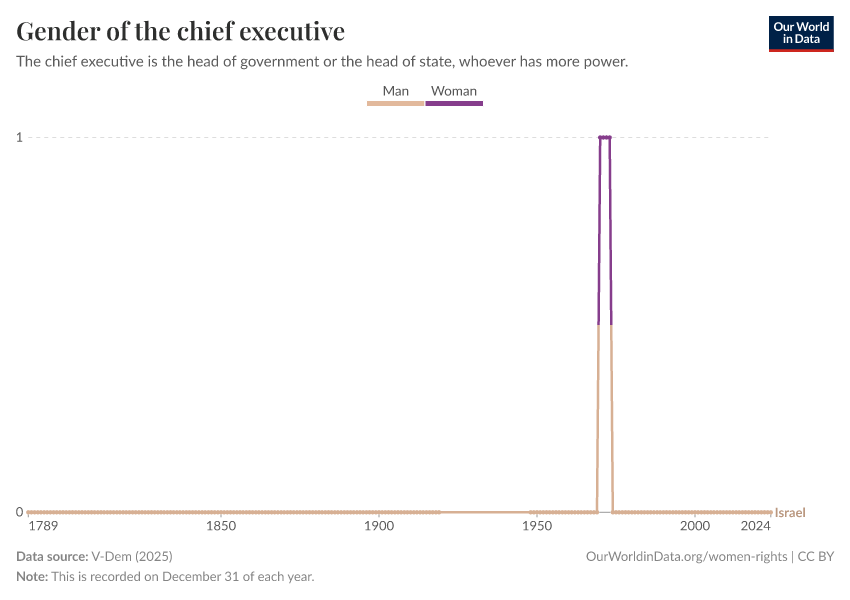 V-Dem (2025) – processed by Our World in Data. “Gender of the chief executive” [dataset]. V-Dem, “Democracy report v15” [original data]. Retrieved November 9, 2025 from https://archive.ourworldindata.org/20250909-093708/grapher/gender-of-chief-executive.html (archived on September 9, 2025).