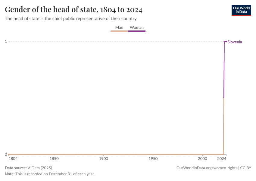 V-Dem (2025) – processed by Our World in Data. “Gender of the head of state” [dataset]. V-Dem, “Democracy report v15” [original data]. Retrieved January 12, 2026 from https://archive.ourworldindata.org/20250909-093708/grapher/gender-of-the-head-of-state.html (archived on September 9, 2025).