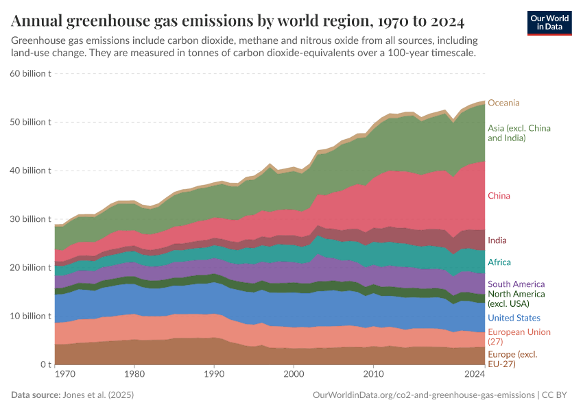 Jones et al. (2025) – with major processing by Our World in Data. “Annual greenhouse gas emissions including land use” [dataset]. Jones et al., “National contributions to climate change 2025.1” [original data]. Retrieved December 13, 2025 from https://archive.ourworldindata.org/20251204-133820/grapher/ghg-emissions-by-world-region.html (archived on December 4, 2025).