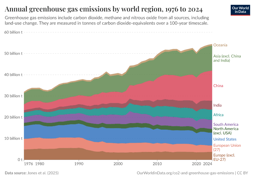 Jones et al. (2025) – with major processing by Our World in Data. “Annual greenhouse gas emissions including land use” [dataset]. Jones et al., “National contributions to climate change 2025.1” [original data]. Retrieved December 30, 2025 from https://archive.ourworldindata.org/20251204-133820/grapher/ghg-emissions-by-world-region.html (archived on December 4, 2025).
