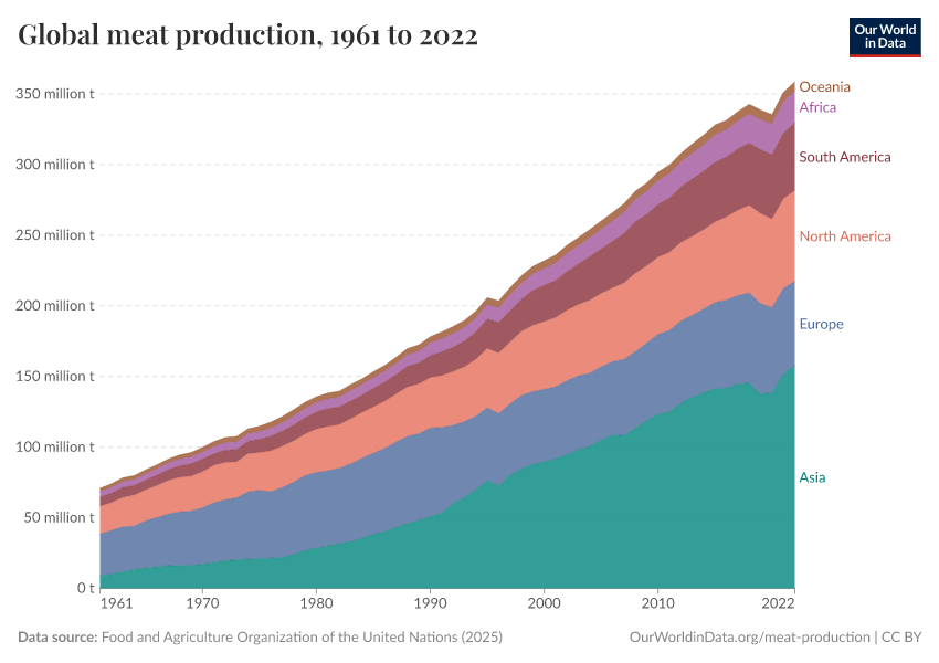 Food and Agriculture Organization of the United Nations (2025) – with major processing by Our World in Data. “Total meat production – UN FAO” [dataset]. Food and Agriculture Organization of the United Nations, “Production: Crops and livestock products” [original data]. Retrieved December 8, 2025 from https://archive.ourworldindata.org/20251014-161652/grapher/global-meat-production.html (archived on October 14, 2025).