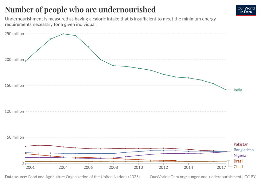 Food and Agriculture Organization of the United Nations (2025) – with major processing by Our World in Data. “Number of people that are undernourished – UN FAO” [dataset]. Food and Agriculture Organization of the United Nations, “SDG Indicators” [original data]. Retrieved December 15, 2025 from https://archive.ourworldindata.org/20250909-093708/grapher/number-undernourished.html (archived on September 9, 2025).