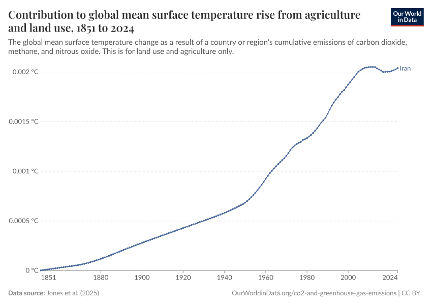 Jones et al. (2025) – with major processing by Our World in Data. “Change in global mean surface temperature caused by greenhouse gas emissions from agriculture and land use” [dataset]. Jones et al., “National contributions to climate change 2025.1” [original data]. Retrieved December 5, 2025 from https://archive.ourworldindata.org/20251204-133820/grapher/global-warming-land.html (archived on December 4, 2025).