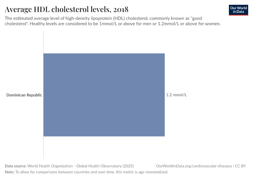 “Data Page: Average HDL cholesterol levels”. Our World in Data (2025). Data adapted from World Health Organization. Retrieved from https://archive.ourworldindata.org/20250909-093708/grapher/good-cholesterol-levels-age-standardized.html [online resource] (archived on September 9, 2025).How to cite this data