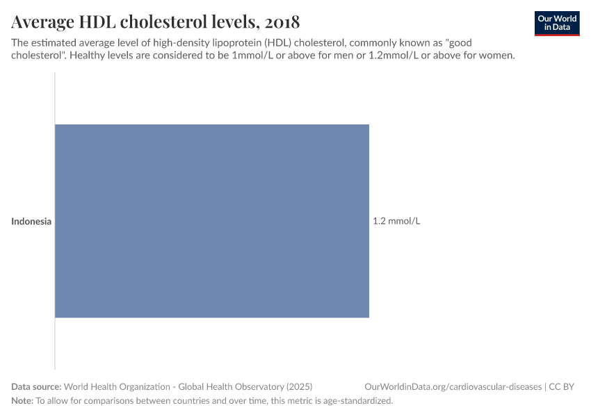 “Data Page: Average HDL cholesterol levels”. Our World in Data (2025). Data adapted from World Health Organization. Retrieved from https://archive.ourworldindata.org/20250909-093708/grapher/good-cholesterol-levels-age-standardized.html [online resource] (archived on September 9, 2025).How to cite this data