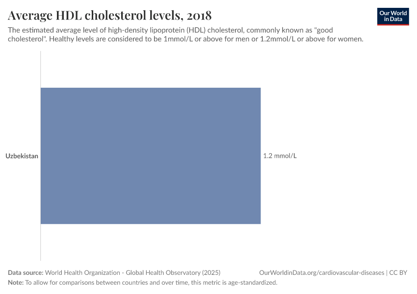 “Data Page: Average HDL cholesterol levels”. Our World in Data (2026). Data adapted from World Health Organization. Retrieved from https://archive.ourworldindata.org/20260119-070102/grapher/good-cholesterol-levels-age-standardized.html [online resource] (archived on January 19, 2026).How to cite this data