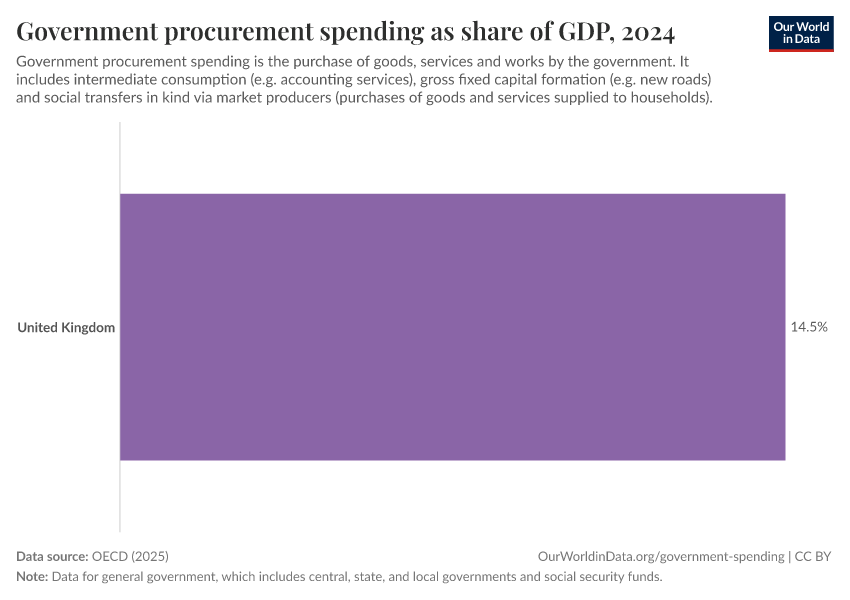 OECD (2025) – with minor processing by Our World in Data. “Government procurement spending as share of GDP – OECD” [dataset]. OECD, “Public finance main indicators - Government at a glance, Yearly updates”; OECD, “Size of public procurement - Government at a glance indicators, Yearly updates”; OECD, “Public finance by economic transaction - Government at a glance indicators, Yearly updates”; OECD, “Public finance by function - Government at a glance indicators, Yearly updates” [original data]. Retrieved January 12, 2026 from https://archive.ourworldindata.org/20250909-093708/grapher/government-procurement-share-gdp.html (archived on September 9, 2025).