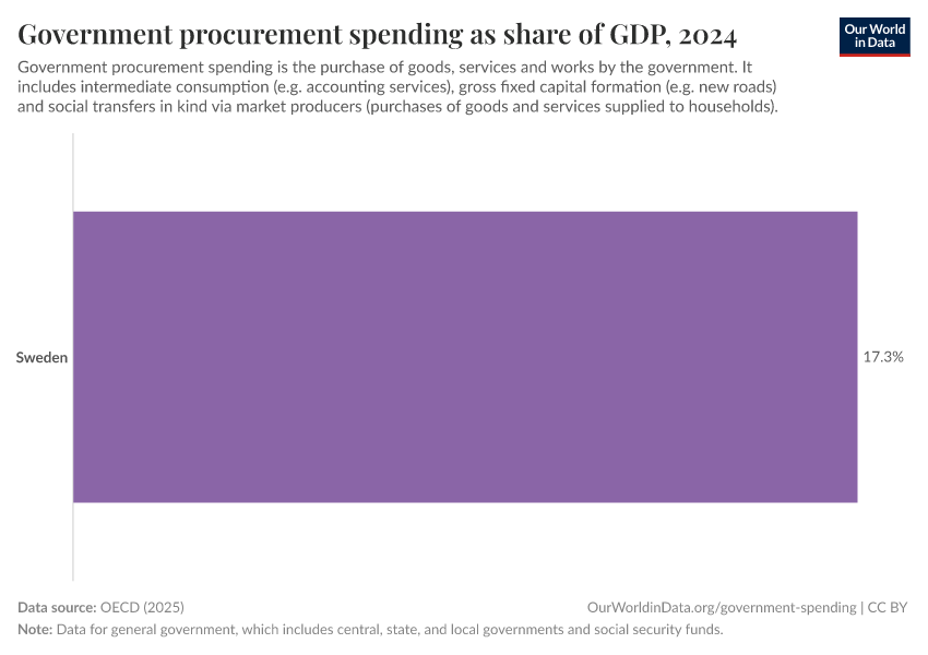 OECD (2025) – with minor processing by Our World in Data. “Government procurement spending as share of GDP – OECD” [dataset]. OECD, “Public finance main indicators - Government at a glance, Yearly updates”; OECD, “Size of public procurement - Government at a glance indicators, Yearly updates”; OECD, “Public finance by economic transaction - Government at a glance indicators, Yearly updates”; OECD, “Public finance by function - Government at a glance indicators, Yearly updates” [original data]. Retrieved December 29, 2025 from https://archive.ourworldindata.org/20250909-093708/grapher/government-procurement-share-gdp.html (archived on September 9, 2025).