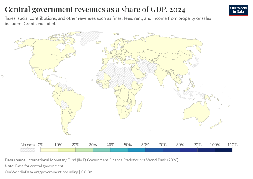 “Data Page: Central government revenues as a share of GDP”. Our World in Data (2026). Data adapted from International Monetary Fund (IMF) Government Finance Statistics, via World Bank. Retrieved from https://archive.ourworldindata.org/20260202-181317/grapher/government-revenues-as-a-share-of-gdp-world-bank.html [online resource] (archived on February 2, 2026).How to cite this data