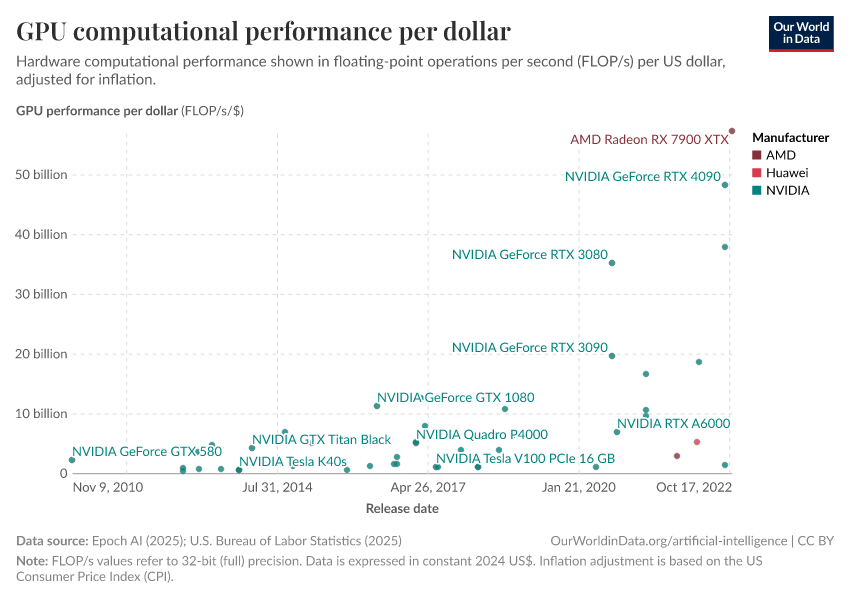 Epoch AI (2025); U.S. Bureau of Labor Statistics (2025) – with major processing by Our World in Data. “GPU computational performance per dollar” [dataset]. Epoch AI, “Machine Learning Hardware”; U.S. Bureau of Labor Statistics, “US consumer prices” [original data]. Retrieved December 14, 2025 from https://archive.ourworldindata.org/20251110-143417/grapher/gpu-price-performance.html (archived on November 10, 2025).