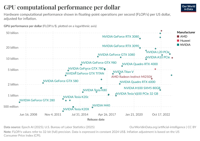 Epoch AI (2025); U.S. Bureau of Labor Statistics (2025) – with major processing by Our World in Data. “GPU computational performance per dollar” [dataset]. Epoch AI, “Machine Learning Hardware”; U.S. Bureau of Labor Statistics, “US consumer prices” [original data]. Retrieved December 8, 2025 from https://archive.ourworldindata.org/20251110-143417/grapher/gpu-price-performance.html (archived on November 10, 2025).