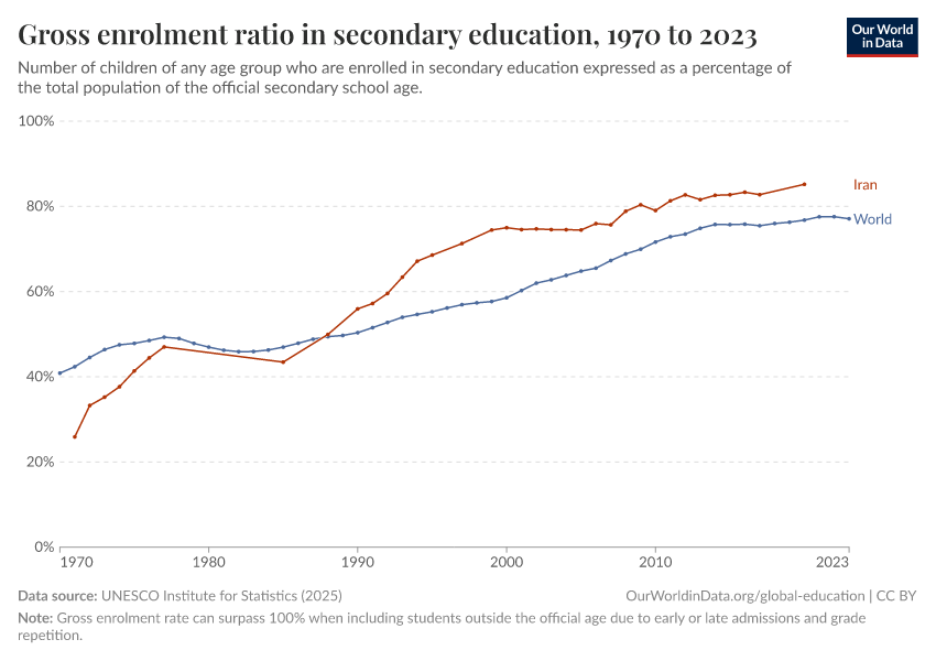 UNESCO Institute for Statistics (2025) – with minor processing by Our World in Data. “Gross enrolment ratio in secondary education” [dataset]. UNESCO Institute for Statistics, “UNESCO Institute for Statistics (UIS) - Education” [original data]. Retrieved December 20, 2025 from https://archive.ourworldindata.org/20250909-093708/grapher/gross-enrollment-ratio-in-secondary-education.html (archived on September 9, 2025).