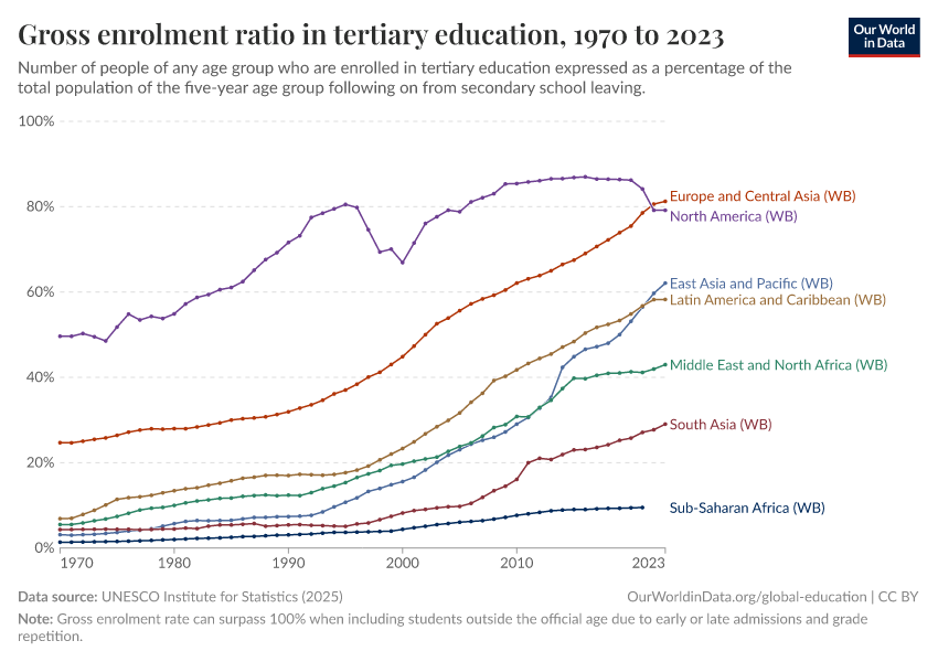 UNESCO Institute for Statistics (2025) – with minor processing by Our World in Data. “Gross enrolment ratio in tertiary education” [dataset]. UNESCO Institute for Statistics, “UNESCO Institute for Statistics (UIS) - Education” [original data]. Retrieved December 14, 2025 from https://archive.ourworldindata.org/20250909-093708/grapher/gross-enrollment-ratio-in-tertiary-education.html (archived on September 9, 2025).