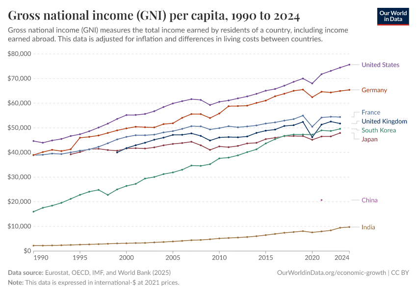 “Data Page: Gross national income (GNI) per capita”, part of the following publication: Max Roser, Bertha Rohenkohl, Pablo Arriagada, Joe Hasell, Hannah Ritchie, and Esteban Ortiz-Ospina (2023) - “Economic Growth”. Data adapted from Eurostat, OECD, IMF, and World Bank. Retrieved from https://archive.ourworldindata.org/20251220-152415/grapher/gross-national-income-per-capita-worldbank.html [online resource] (archived on December 20, 2025).How to cite this data