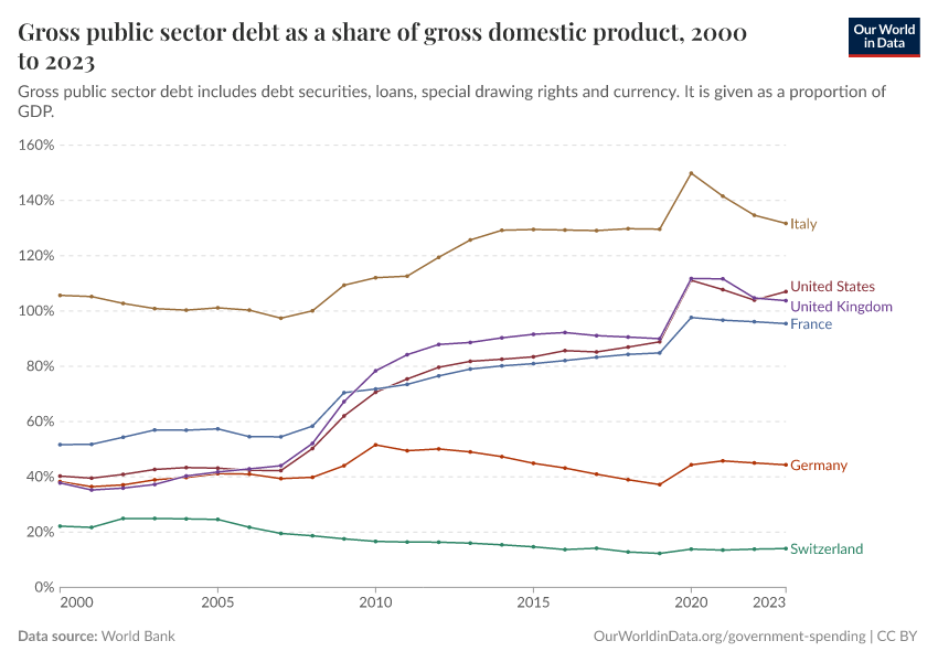 “Data Page: Gross public sector debt as a share of gross domestic product”. Our World in Data (2025). Data adapted from World Bank. Retrieved from https://archive.ourworldindata.org/20251120-211749/grapher/gross-public-sector-debt-as-a-proportion-of-gdp.html [online resource] (archived on November 20, 2025).How to cite this data