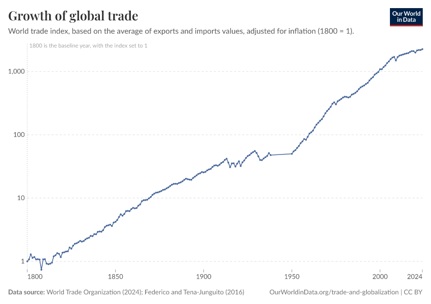 World Trade Organization (2024); Federico and Tena-Junguito (2016) – processed by Our World in Data. “Growth of global trade” [dataset]. World Trade Organization, “Evolution of trade under the WTO: handy statistics”; Federico and Tena-Junguito, “A tale of two globalizations: gains from trade and openness 1800–2010” [original data]. Retrieved January 29, 2026 from https://archive.ourworldindata.org/20251104-122843/grapher/growth-of-global-trade.html (archived on November 4, 2025).