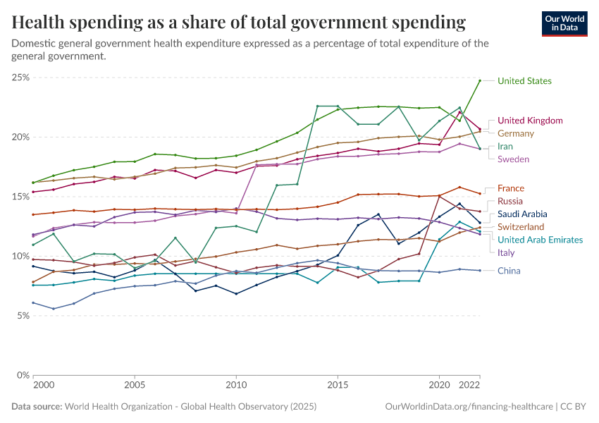 World Health Organization - Global Health Observatory (2025) – processed by Our World in Data. “Health spending as a share of total government spending” [dataset]. World Health Organization, “Global Health Observatory” [original data]. Retrieved December 13, 2025 from https://archive.ourworldindata.org/20250909-093708/grapher/health-expenditure-government-expenditure.html (archived on September 9, 2025).