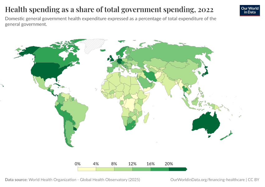 “Data Page: Health spending as a share of total government spending”. Our World in Data (2025). Data adapted from World Health Organization. Retrieved from https://archive.ourworldindata.org/20250909-093708/grapher/health-expenditure-government-expenditure.html [online resource] (archived on September 9, 2025).How to cite this data