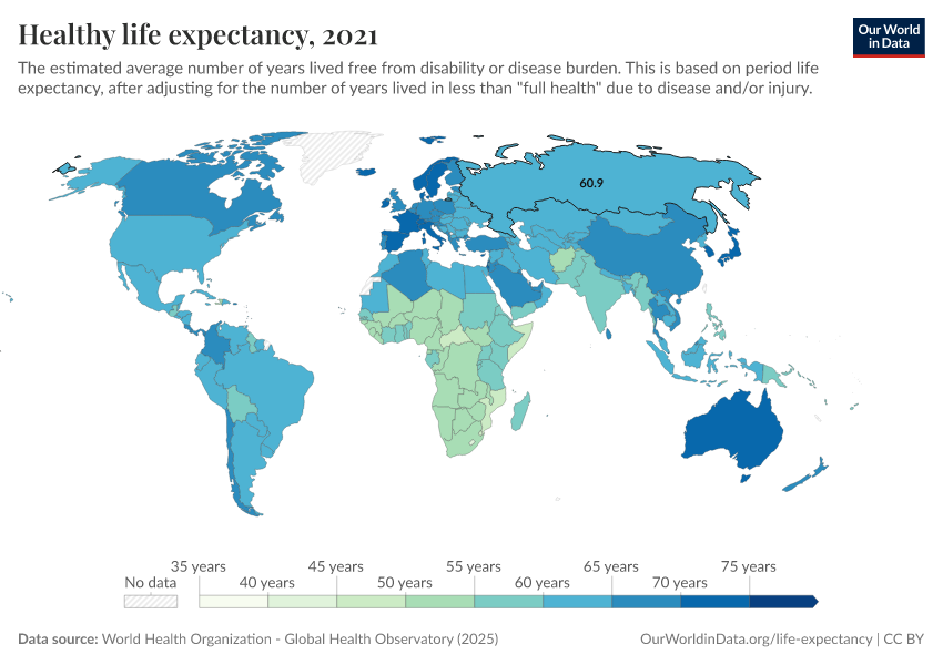 “Data Page: Healthy life expectancy”. Our World in Data (2026). Data adapted from World Health Organization. Retrieved from https://archive.ourworldindata.org/20250909-093708/grapher/healthy-life-expectancy-at-birth.html [online resource] (archived on September 9, 2025).How to cite this data