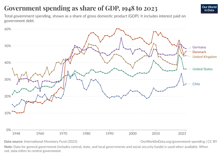 “Data Page: Government spending as share of GDP”, part of the following publication: Esteban Ortiz-Ospina, Bertha Rohenkohl, Pablo Arriagada, and Max Roser (2016) - “Government Spending”. Data adapted from International Monetary Fund. Retrieved from https://archive.ourworldindata.org/20250909-093708/grapher/historical-gov-spending-gdp.html [online resource] (archived on September 9, 2025).