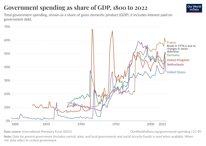 International Monetary Fund (2025) – with minor processing by Our World in Data. “Government spending as share of GDP” [dataset]. International Monetary Fund, “Public Finances in Modern History” [original data]. Retrieved December 30, 2025 from https://archive.ourworldindata.org/20250909-093708/grapher/historical-gov-spending-gdp.html (archived on September 9, 2025).