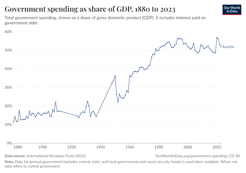 International Monetary Fund (2025) – with minor processing by Our World in Data. “Government spending as share of GDP” [dataset]. International Monetary Fund, “Public Finances in Modern History” [original data]. Retrieved March 12, 2026 from https://archive.ourworldindata.org/20260304-094028/grapher/historical-gov-spending-gdp.html (archived on March 4, 2026).