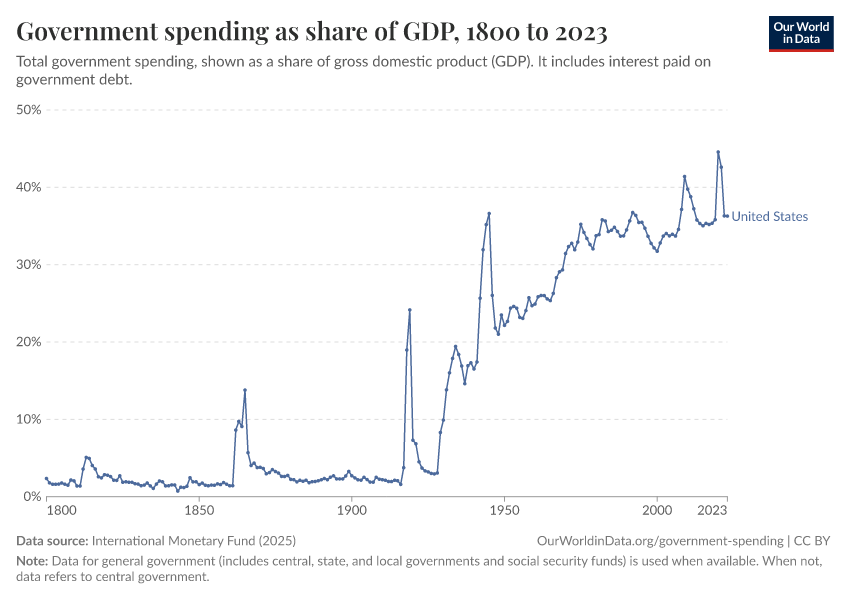 International Monetary Fund (2025) – with minor processing by Our World in Data. “Government spending as share of GDP” [dataset]. International Monetary Fund, “Public Finances in Modern History” [original data]. Retrieved April 5, 2026 from https://archive.ourworldindata.org/20260304-094028/grapher/historical-gov-spending-gdp.html (archived on March 4, 2026).Download