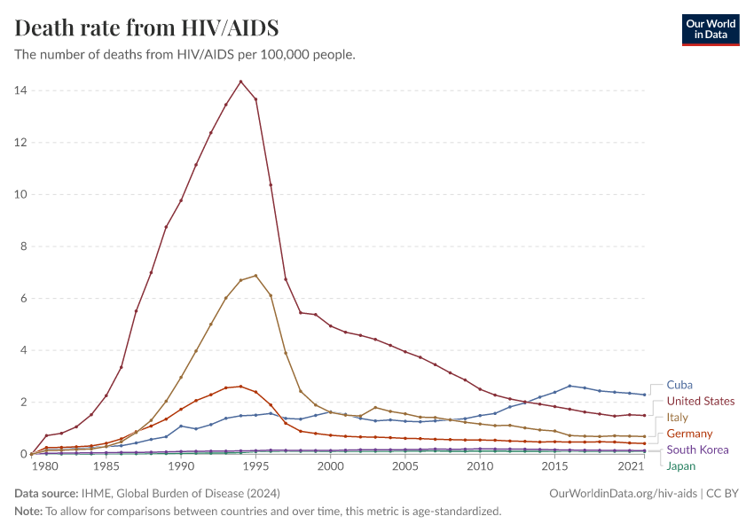 IHME, Global Burden of Disease (2024) – with minor processing by Our World in Data. “Death rate from HIV/AIDS” [dataset]. IHME, Global Burden of Disease, “Global Burden of Disease - Deaths and DALYs” [original data]. Retrieved January 16, 2026 from https://archive.ourworldindata.org/20250909-093708/grapher/hiv-death-rates.html (archived on September 9, 2025).
