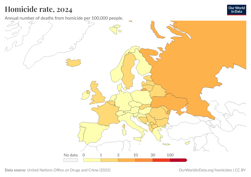 UN, World Population Prospects (2024); United Nations Office on Drugs and Crime (2025) – with major processing by Our World in Data. “Homicide rate per 100,000 population” [dataset]. United Nations Office on Drugs and Crime, “United Nations Office on Drugs and Crime - Intentional Homicide Victims”; United Nations, “World Population Prospects”; Various sources, “Population” [original data]. Retrieved December 31, 2025 from https://archive.ourworldindata.org/20251209-133038/grapher/homicide-rate-unodc.html (archived on December 9, 2025).