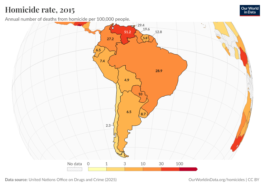“Data Page: Homicide rate per 100,000 population”, part of the following publication: Bastian Herre, Fiona Spooner, Hannah Ritchie, and Max Roser (2013) - “Homicides”. Data adapted from United Nations Office on Drugs and Crime, United Nations, Various sources. Retrieved from https://archive.ourworldindata.org/20260119-065148/grapher/homicide-rate-unodc.html [online resource] (archived on January 19, 2026).How to cite this data