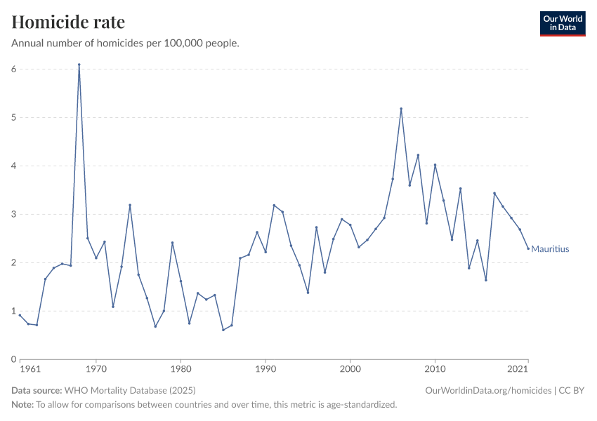 WHO Mortality Database (2025) – with minor processing by Our World in Data. “Homicide rate” [dataset]. WHO Mortality Database, “WHO Mortality Database” [original data]. Retrieved December 20, 2025 from https://archive.ourworldindata.org/20251209-133038/grapher/homicide-rate-who-age-standardized.html (archived on December 9, 2025).