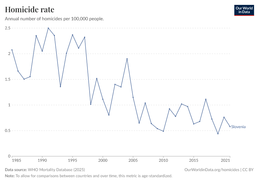 WHO Mortality Database (2025) – with minor processing by Our World in Data. “Homicide rate” [dataset]. WHO Mortality Database, “WHO Mortality Database” [original data]. Retrieved December 25, 2025 from https://archive.ourworldindata.org/20251209-133038/grapher/homicide-rate-who-age-standardized.html (archived on December 9, 2025).
