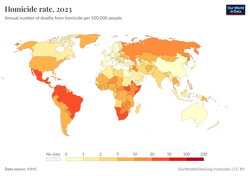 IHME, Global Burden of Disease (2024) – with minor processing by Our World in Data. “Homicide rate” [dataset]. IHME, Global Burden of Disease, “Global Burden of Disease - Deaths and DALYs” [original data]. Retrieved February 10, 2026 from https://archive.ourworldindata.org/20260105-133053/grapher/homicide-rate.html (archived on January 5, 2026).