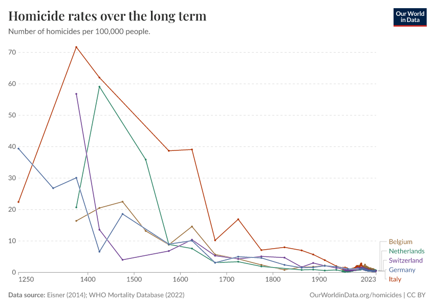 “Data Page: Homicide rates over the long term”. Our World in Data (2026). Data adapted from Eisner (2014); WHO Mortality Database (2024). Retrieved from https://archive.ourworldindata.org/20260428-121251/grapher/homicide-rates-across-western-europe.html [online resource] (archived on April 28, 2026).How to cite this data