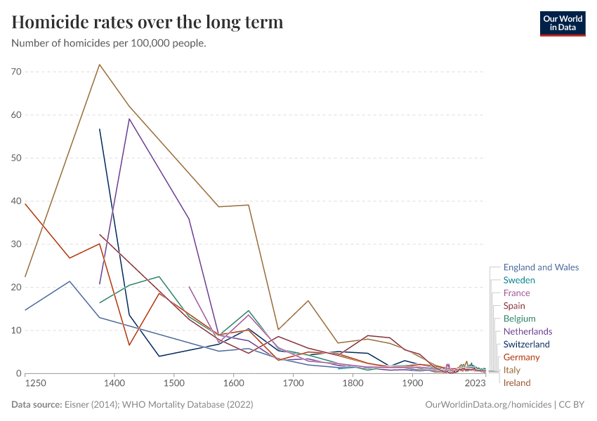 “Data Page: Homicide rates over the long term”. Our World in Data (2025). Data adapted from Eisner (2014); WHO Mortality Database (2024). Retrieved from https://archive.ourworldindata.org/20250909-093708/grapher/homicide-rates-across-western-europe.html [online resource] (archived on September 9, 2025).How to cite this data