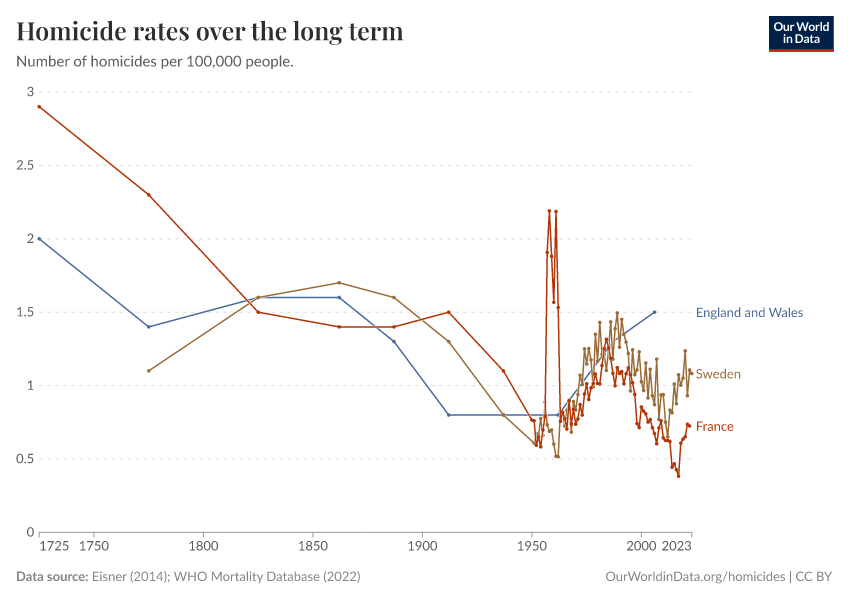 “Data Page: Homicide rates over the long term”. Our World in Data (2025). Data adapted from Eisner (2014); WHO Mortality Database (2024). Retrieved from https://archive.ourworldindata.org/20250909-093708/grapher/homicide-rates-across-western-europe.html [online resource] (archived on September 9, 2025).How to cite this data