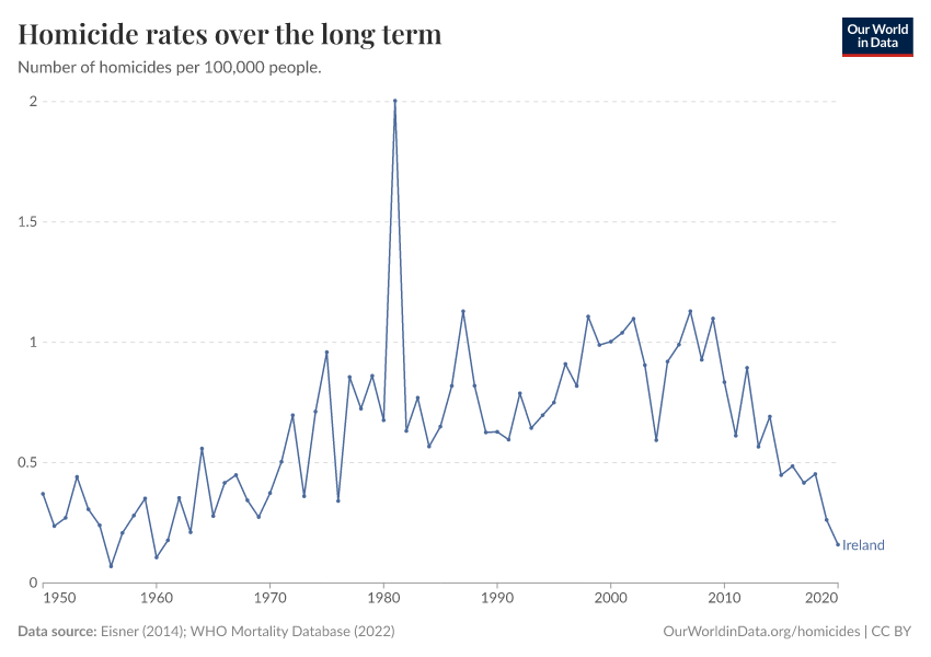 “Data Page: Homicide rates over the long term”. Our World in Data (2025). Data adapted from Eisner (2014); WHO Mortality Database (2024). Retrieved from https://archive.ourworldindata.org/20250909-093708/grapher/homicide-rates-across-western-europe.html [online resource] (archived on September 9, 2025).How to cite this data