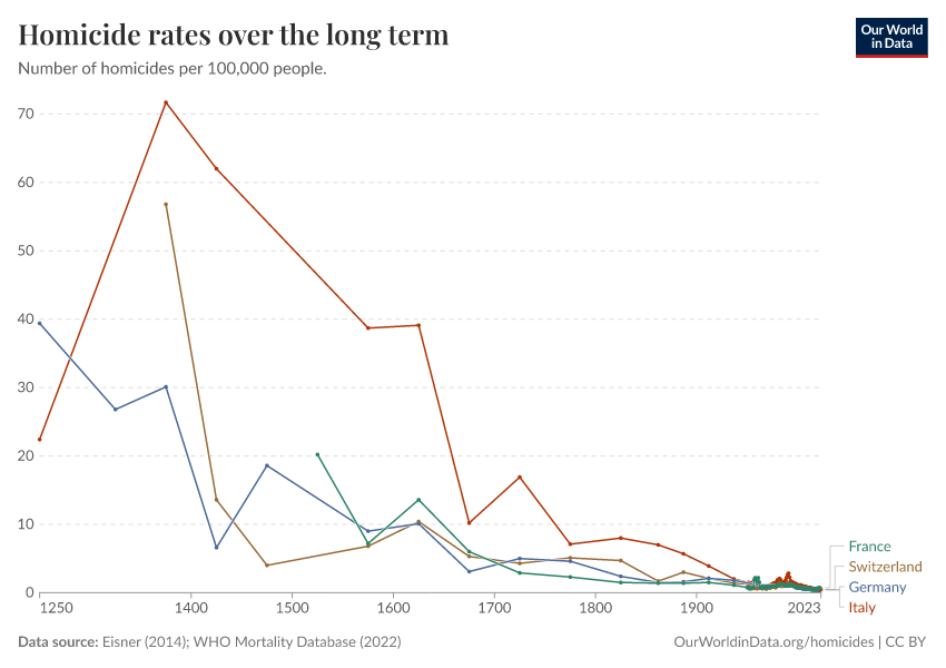 “Data Page: Homicide rates over the long term”. Our World in Data (2026). Data adapted from Eisner (2014); WHO Mortality Database (2024). Retrieved from https://archive.ourworldindata.org/20250909-093708/grapher/homicide-rates-across-western-europe.html [online resource] (archived on September 9, 2025).How to cite this data