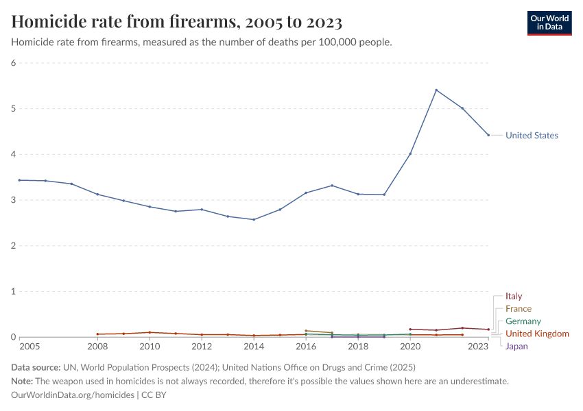 UN, World Population Prospects (2024); United Nations Office on Drugs and Crime (2025) – with major processing by Our World in Data. “Homicide rate per 100,000 population where the weapon was a firearm” [dataset]. United Nations Office on Drugs and Crime, “United Nations Office on Drugs and Crime - Intentional Homicide Victims”; United Nations, “World Population Prospects”; Various sources, “Population” [original data]. Retrieved January 15, 2026 from https://archive.ourworldindata.org/20260105-133053/grapher/homicide-rates-from-firearms.html (archived on January 5, 2026).