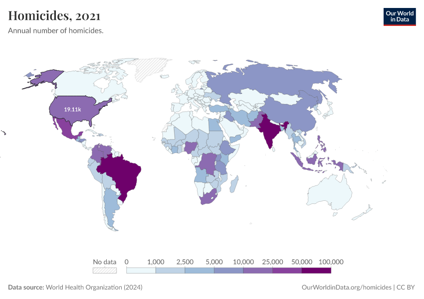 World Health Organization (2024) – with major processing by Our World in Data. “Homicides” [dataset]. World Health Organization, “Global Health Estimates” [original data]. Retrieved April 25, 2026 from https://archive.ourworldindata.org/20260325-171315/grapher/homicidesghe.html (archived on March 25, 2026).Download