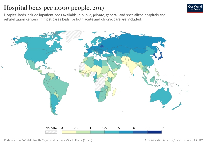 “Data Page: Hospital beds per 1,000 people”. Our World in Data (2025). Data adapted from World Health Organization, via World Bank. Retrieved from https://archive.ourworldindata.org/20250916-102301/grapher/hospital-beds-per-1000-people.html [online resource] (archived on September 16, 2025).How to cite this data