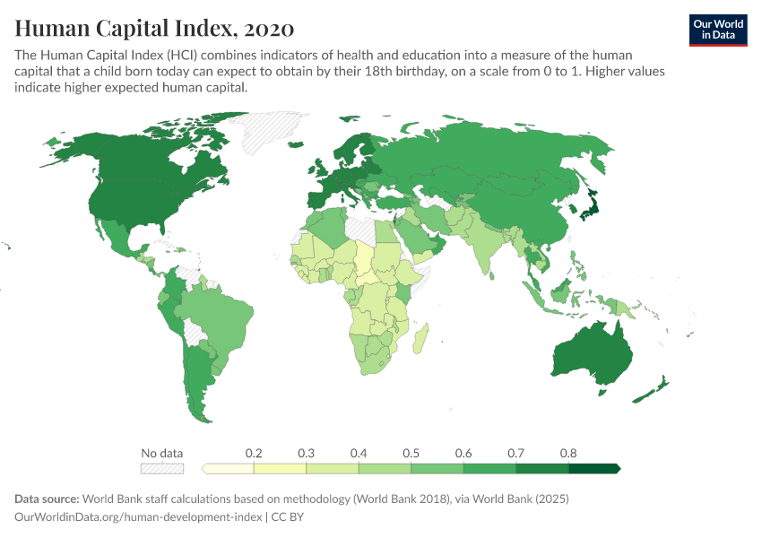 “Data Page: Human Capital Index”. Our World in Data (2026). Data adapted from World Bank staff calculations based on methodology (World Bank 2018), via World Bank. Retrieved from https://archive.ourworldindata.org/20260105-133053/grapher/human-capital-index-in-2018.html [online resource] (archived on January 5, 2026).How to cite this data