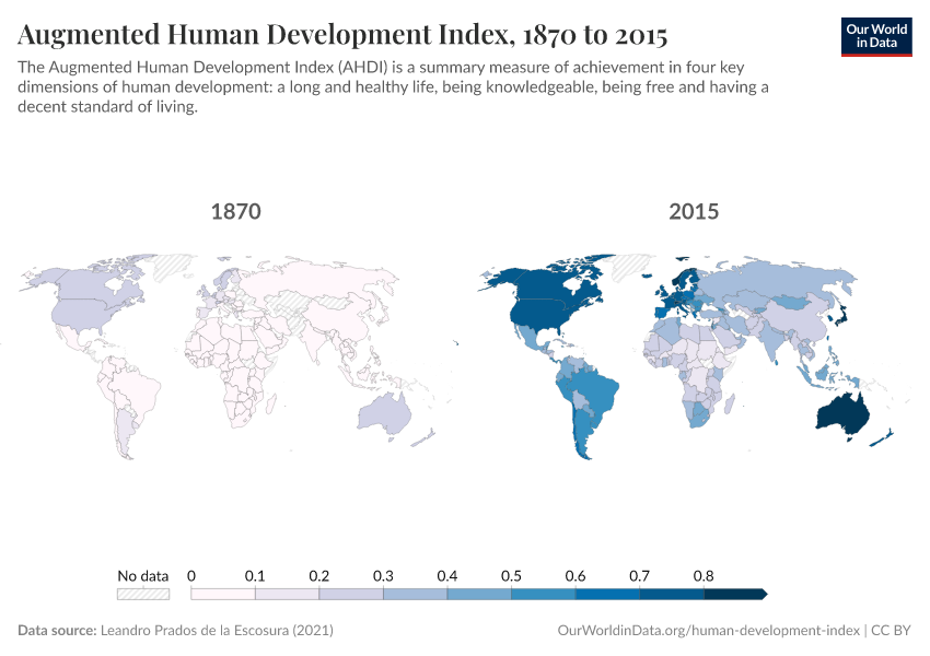 Leandro Prados de la Escosura (2021) – with minor processing by Our World in Data. “Augmented Human Development Index” [dataset]. Leandro Prados de la Escosura, “Augmented Human Development Index (AHDI) - Country data”; Leandro Prados de la Escosura, “Augmented Human Development Index (AHDI) - Regional data” [original data]. Retrieved December 14, 2025 from https://archive.ourworldindata.org/20251209-133038/grapher/augmented-human-development-index.html (archived on December 9, 2025).