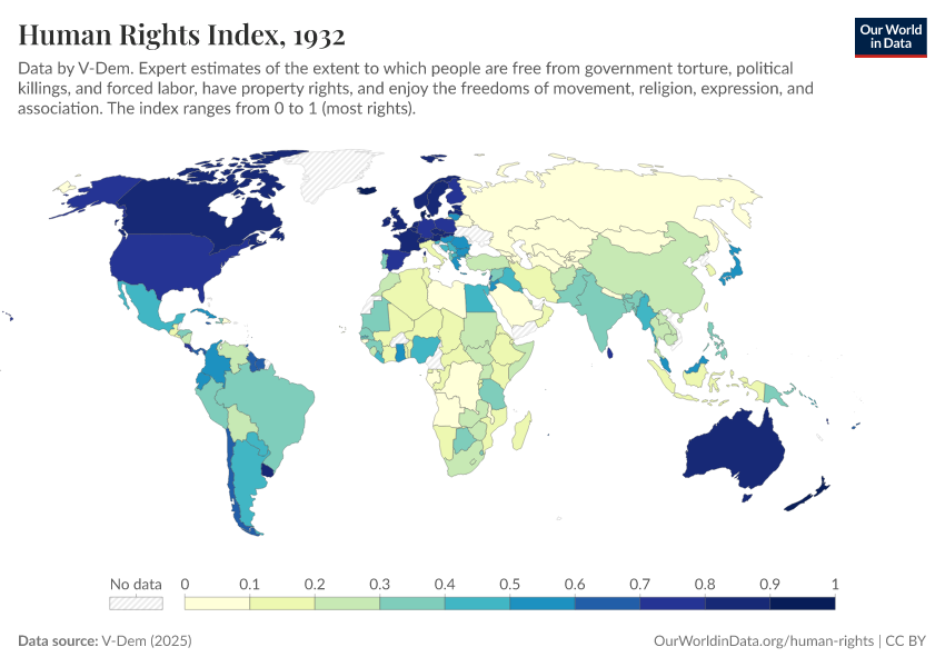 “Data Page: Human rights index”, part of the following publication: Bastian Herre, Lucas Rodés-Guirao, and Esteban Ortiz-Ospina (2013) - “Democracy”. Data adapted from V-Dem. Retrieved from https://archive.ourworldindata.org/20260105-133053/grapher/human-rights-index-vdem.html [online resource] (archived on January 5, 2026).