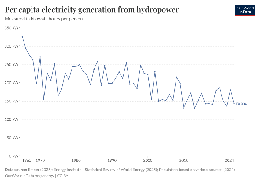 “Data Page: Electricity generation from hydropower per person”, part of the following publication: Hannah Ritchie, Pablo Rosado, and Max Roser (2023) - “Energy”. Data adapted from Ember, Energy Institute, Various sources. Retrieved from https://archive.ourworldindata.org/20250925-233948/grapher/hydro-electricity-per-capita.html [online resource] (archived on September 25, 2025).