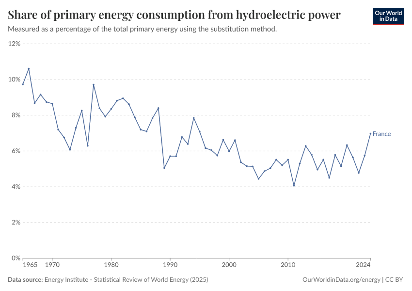 Energy Institute - Statistical Review of World Energy (2025) – with major processing by Our World in Data. “Share of primary energy consumption that comes from hydropower – Using the substitution method” [dataset]. Energy Institute, “Statistical Review of World Energy” [original data]. Retrieved January 13, 2026 from https://archive.ourworldindata.org/20250909-093708/grapher/hydro-share-energy.html (archived on September 9, 2025).