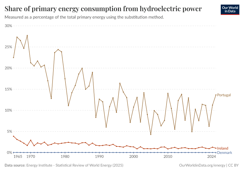 Energy Institute - Statistical Review of World Energy (2025) – with major processing by Our World in Data. “Share of primary energy consumption that comes from hydropower – Using the substitution method” [dataset]. Energy Institute, “Statistical Review of World Energy” [original data]. Retrieved December 11, 2025 from https://archive.ourworldindata.org/20250909-093708/grapher/hydro-share-energy.html (archived on September 9, 2025).