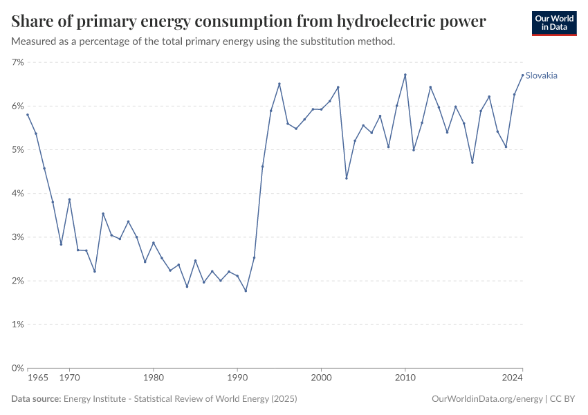 Energy Institute - Statistical Review of World Energy (2025) – with major processing by Our World in Data. “Share of primary energy consumption that comes from hydropower – Using the substitution method” [dataset]. Energy Institute, “Statistical Review of World Energy” [original data]. Retrieved December 5, 2025 from https://archive.ourworldindata.org/20250909-093708/grapher/hydro-share-energy.html (archived on September 9, 2025).